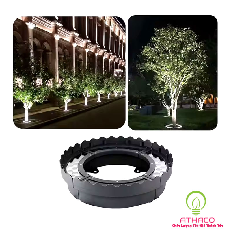 Đèn thiết kế với các ghép nối khung tròn quanh gốc cây, giúp tạo hiệu ứng hắt sáng tán cây, tạo điểm nhấn cho khuôn viên vườn.
