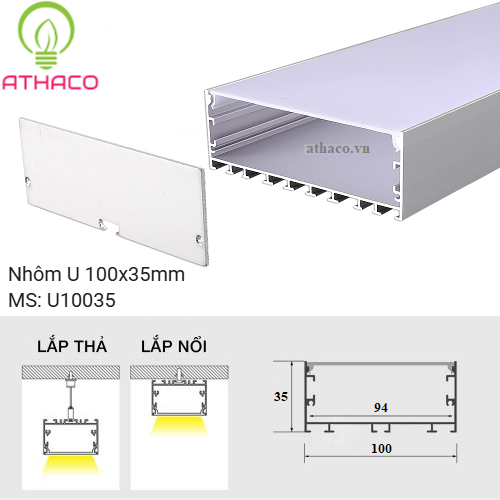 Thanh nhôm chữ U 10035 trang bị kích thước phủ bì là 100x35mm 1 kích thước vừa đủ để gắn nổi hoặc làm đèn thả trần, mang lại sự tiện lợi tối đa trong quá trình thi công và lắp đặt. Hiện nay, AThaco cung cấp mẫu nhôm U 10035 kích thước chiều dài 3m lý tưởng cho các công trình thi công nội thất và xây dựng dân dụng. Mời quý khách cùng xem qua.